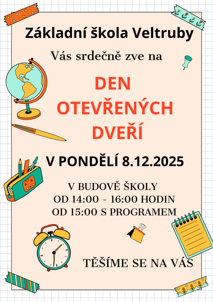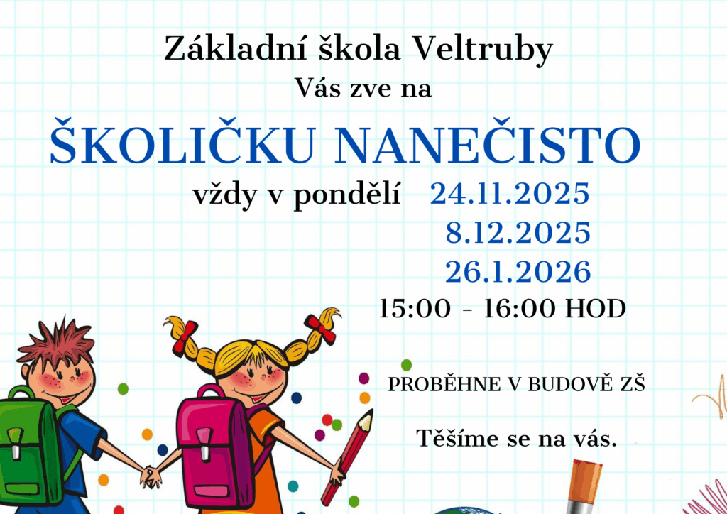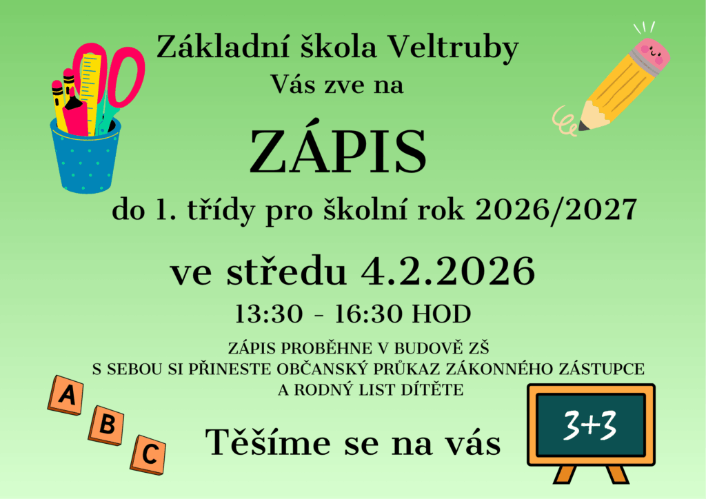 Vážení rodiče, právě byla zahájena rezervace termínu pro zápis do 1. ročníku, který se bude konat 6. dubna 2022 od 14:00 do 18:00 hod v ZŠ Veltruby. Termín si můžete rezervovat v MŠ Veltruby, případně kontaktujte koordinátora zápisu Mgr. Anetu Janovcovou ve všední dny od 14:00 do 16:00. Více informací naleznete v přiloženém odkazu.